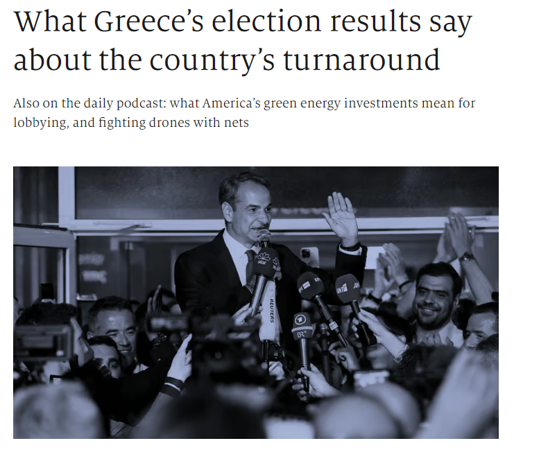 Τις αιτίες της επιβλητικής νίκης της Νέας Δημοκρατίας στις εθνικές εκλογές της 21ης Μαΐου, ανέλυσε σε podcast δημοσιογράφος του Economist. Ο υπεύθυνος για ευρωπαϊκά θέματα, Κρις Λόκγουντ, έκανε αρχικά λόγο για τους υψηλούς ρυθμούς ανάπτυξης που πέτυχε η κυβέρνηση του Κυριάκου Μητσοτάκη, μολονότι κλήθηκε να διαχειριστεί πολλαπλές εξωγενείς κρίσεις και επανέφερε την Ελλάδα σε μία κανονικότητα που την έχει μετατρέψει σε επενδυτικό προορισμό, ενώ ταυτόχρονα έχει αποκαταστήσει την εικόνα μιας υπεύθυνης, σταθερής δύναμης στα μάτια της διεθνούς κοινότητας.