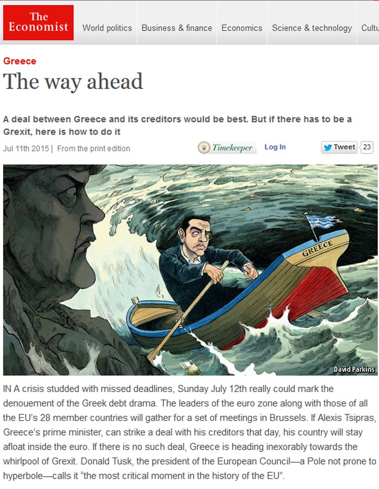 Ως Ποσειδώνα που κοιτά με εκνευρισμένο ύφος τον Αλέξη Τσίπρα παρουσιάζει την Γερμανίδα καγκελάριο Μέρκελ το περιοδικό Economist σε νέο σκίτσο που δημοσίευσε για την ελληνική κρίση…