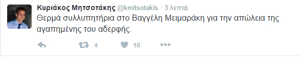 Πληροφορηθείς τη δυσάρεστη είδηση, ο Κ. Μητσοτάκης ανήρτησε στον λογαριασμό του στο twitter: «Θερμά συλλυπητήρια στο Βαγγέλη Μεϊμαράκη για την απώλεια της αγαπημένης του αδερφής».