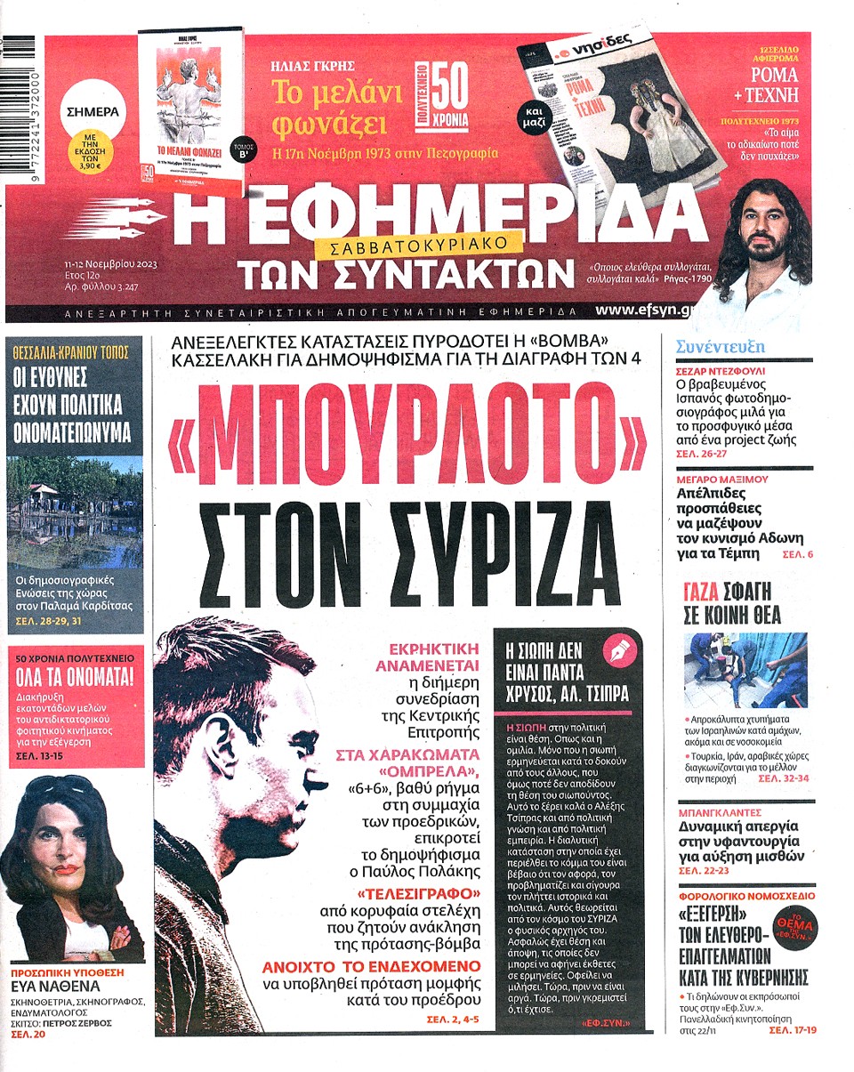 Στο άρθρο υπό τον τίτλο «Η σιωπή δεν είναι πάντα χρυσός, Αλ. Τσίπρα», η Εφσυν τονίζει ότι η διαλυτική κατάσταση στο κόμμα τον αφορά καθώς είναι ο φυσικός αρχηγός του ΣΥΡΙΖΑ. «Οφείλει να μιλήσει τώρα, πριν γκρεμιστεί ό,τι έχτισε» επισημαίνει η εφημερίδα.