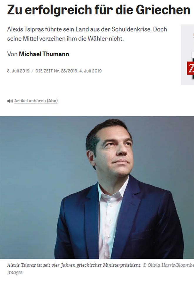 Ο Αλέξης Τσίπρας «πέτυχε ένα σημαντικό κατόρθωμα πολιτικής ηγετικής ικανότητας, διότι ξεμπλόκαρε τις σχέσεις με τη Βόρεια Μακεδονία», δηλώνει ο κ. Σόιμπλε στη σημερινή έκδοση της εβδομαδιαίας εφημερίδας «Die Zeit» και πιστώνει στον Έλληνα πρωθυπουργό ότι για τη Συμφωνία των Πρεσπών υπέμεινε «πολιτική αντίσταση στο εσωτερικό» και, όπως επισημαίνει η εφημερίδα, απειλείται με ήττα στις επερχόμενες εκλογές. «Ένας από τους λόγους για αυτό ενδέχεται να είναι και η Συμφωνία για την ονομασία, η οποία εξόργισε πολλούς Έλληνες εναντίον του» προσθέτει η «Zeit».