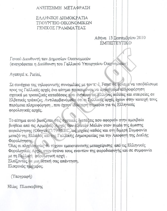 Η επιστολή υπογράφεται από τον πρώην στενό συνεργάτη του κ. Παπακωνσταντίνου και τότε γενικό γραμματέα του υπουργείου, Ηλία Πλασκοβίτη, και απευθύνεται στον Γάλλο ομόλογό του.