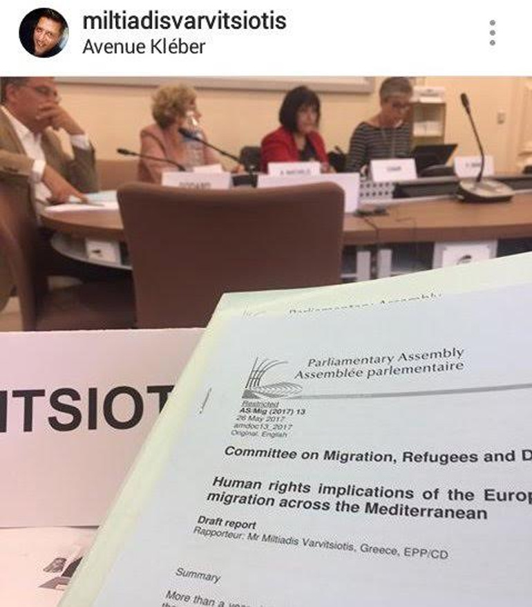 Μάλιστα, ο ίδιος, ανέβασε σχετική φωτογραφία, στον προσωπικό του λογαριασμό στο Instagram, γράφοντας σχετικά: «Μόλις εγκρίθηκε ομόφωνα η έκθεση μου για τα Ανθρώπινα δικαιώματα στις μεταναστευτικές ροές στη Μεσόγειο από την Επιτροπή Μετανάστευσης του Συμβουλίου της Ευρώπης».