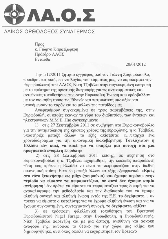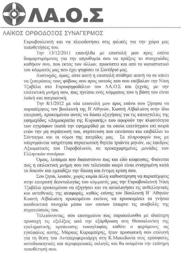 Το στέλεχος του ΛΑΟΣ καταγγέλλει τον Γιώργο Καρατζαφέρη, καθώς όπως αναφέρει στην επιστολή του «απροθυμία να πράξει τα δέοντα», όσον αφορά τις δηλώσεις της Ευρωβουλευτού, Νίκης Τζαβέλλα, τα δημοσιεύματα που αφορούν στην στρατιωτική θητεία του κ. Αϊβαλιώτη, αλλά και τη συμμετοχή του αρχιτοκογλύφου Μάρκου Καραμπέρη στο ψηφοδέλτιο του κόμματος.