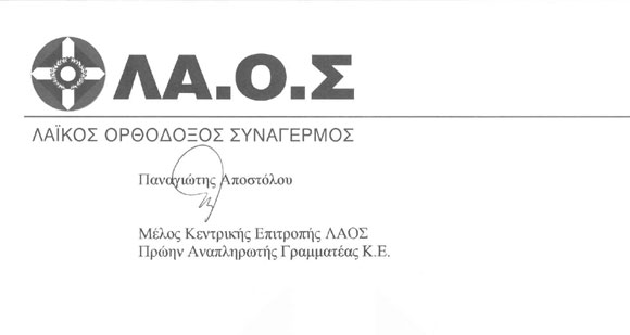Επιστολή απέστειλε το μέλος της Κεντρικής Επιτροπής του ΛΑΟΣ, πρώην αναπληρωτής γραμματέας Κ.Ε., Παναγιώτης Αποστόλου, στον πρόεδρο του κόμματος, Γιώργο Καρατζαφέρη.