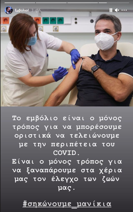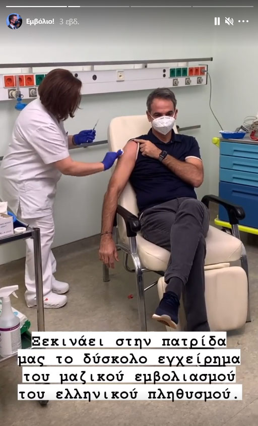 Ο πρωθυπουργός ανάρτησε βίντεο από τη στιγμή του εμβολιασμού του σε story στο Instagram.