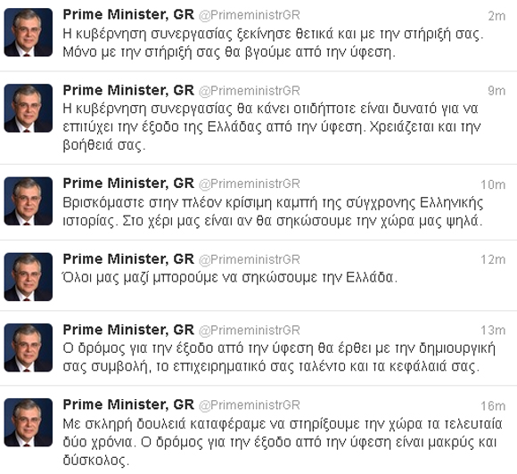 Ο νέος πρωθυπουργός Λουκάς Παπαδήμος προχώρησε την Τετάρτη το βράδυ μέσω του προσωπικού του λογαριασμού στον ιστότοπο κοινωνικής δικτύωσης Twitter, σε έκκληση προς τους πολίτες για τη στήριξη προς τη νέα κυβέρνηση για την έξοδο προς την ύφεση, ενώ επανέλαβε πως «ο δρόμος θα είναι μακρύς και δύσκολος».