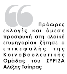 Πρόωρες εκλογές και άμεση προσφυγή στη «λαϊκή ετυμηγορία» ζήτησε ο επικεφαλής της Κοινοβουλευτικής Ομάδας του ΣΥΡΙΖΑ Αλέξης Τσίπρας από τον Πρόεδρο της Δημοκρατίας Κάρολο Παπούλια, κατά τη διάρκεια της σημερινής τους συνάντησης στο Προεδρικό Μέγαρο.