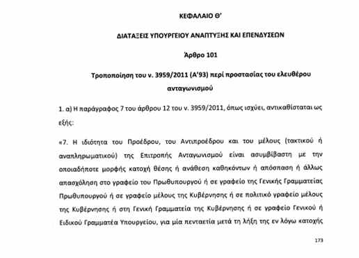 Με βάση το άρθρο 101 του πολυνομοσχεδίου που κατατέθηκε το βράδυ της Παρασκευής στη Βουλή καθιερώνονται —και μάλιστα αναδρομικά— αυστηροί κανόνες για το ασυμβίβαστο ανάμεσα στη θέση του επικεφαλής της Επιτροπής και σε οποιαδήποτε ιδιότητα σχετιζόμενη με κυβερνητικές θέσεις.