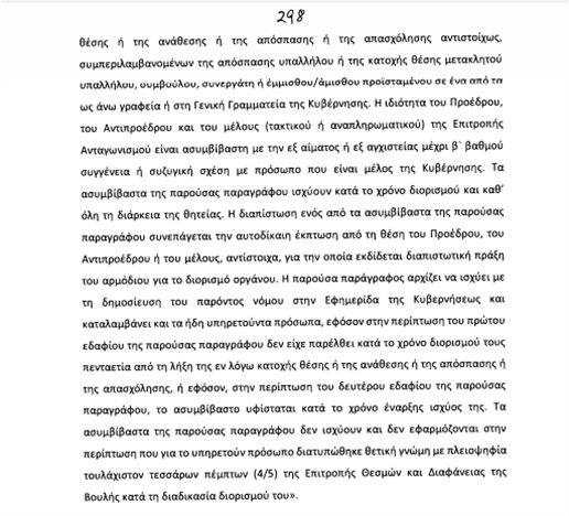 Μεταξύ των οποίων είναι και προηγούμενη θητεία με οποιαδήποτε μορφή σε γραφείο Πρωθυπουργού, ή μελών της κυβέρνησης, ειδικού ή γενικού γραμματέα υπουργείου με τη συγκεκριμένη απαγόρευση να ισχύει για 5 χρόνια από την προηγούμενη θητεία του υπηρετούντος.