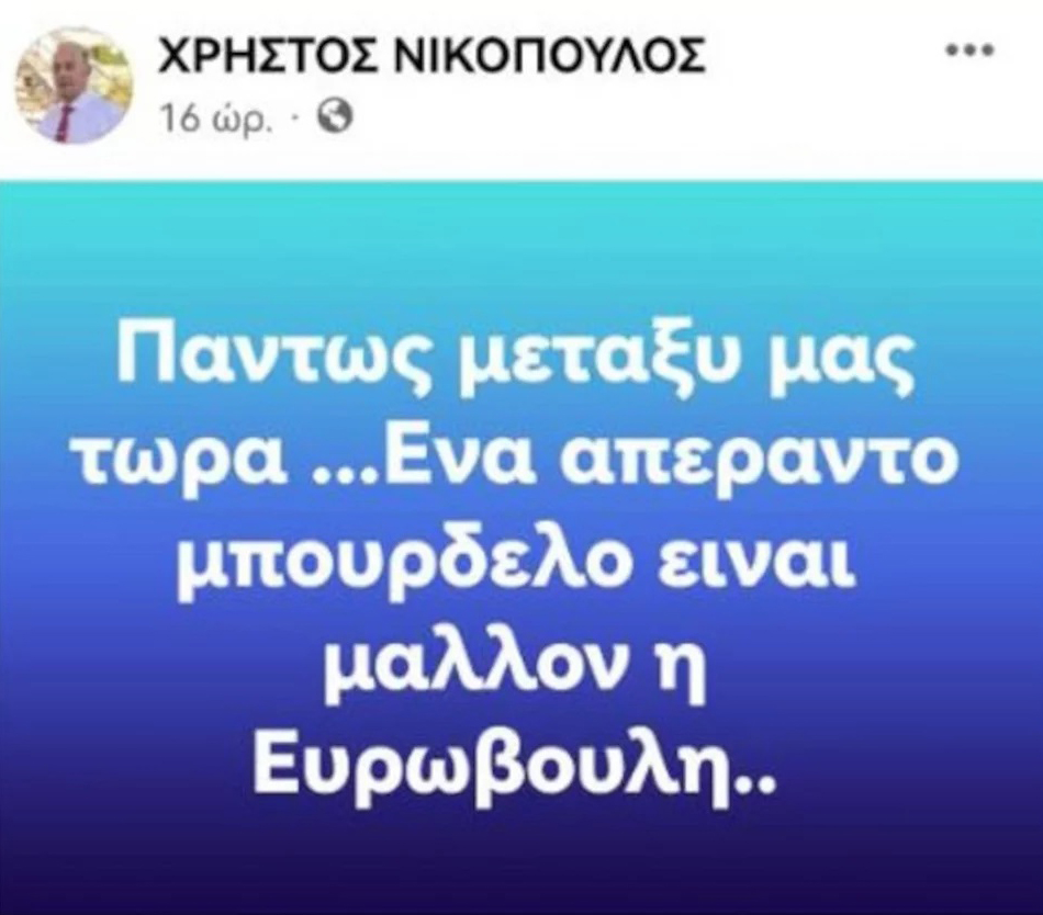 Παραιτήθηκε από μέλος της Γραμματείας της Νομαρχιακής Επιτροπής Μαγνησίας του ΣΥΡΙΖΑ ο Χρήστος Νικόπουλος, μετά από μία σειρά αναρτήσεων που έκανε τις προηγούμενες ημέρες σε βάρος της Ελένης Χρονοπούλου για την καταγγελία της σχετικά με τον βιασμό και την κακοποίηση από τον Αλέξη Γεωργούλη.