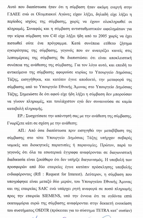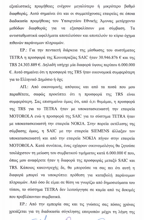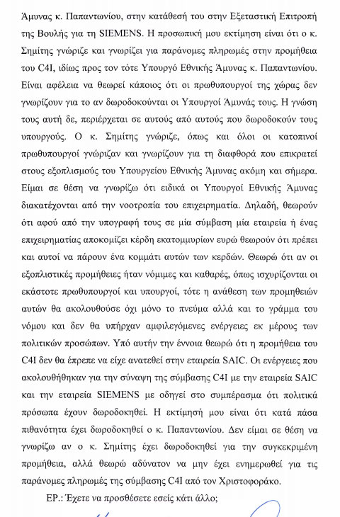 γνωρίζω αν ο κ. Σημίτης έχει δωροδοκηθεί για την συγκεκριμένη προμήθεια, αλλά θεωρώ αδύνατον να μην έχει ενημερωθεί για τις παράνομες πληρωμές της σύμβασης C4I από τον Χριστοφοράκο».