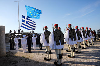 «Στην Τελετή Έπαρσης των Σημαιών Ελλάδας και Ευρώπης στον Ιερό Βράχο της Ακρόπολης, σύμβολο της Δημοκρατίας, για τον εορτασμό της Ημέρας της Ευρώπης και τα 40 χρόνια από την ένταξη της Ελλάδας στην Ε.Ε, παρουσία της Α.Ε της Προέδρου της Δημοκρατίας. Χρόνια Πολλά Ευρώπη!» συμπλήρωσε ο κ. Βαρβιτσιώτης.