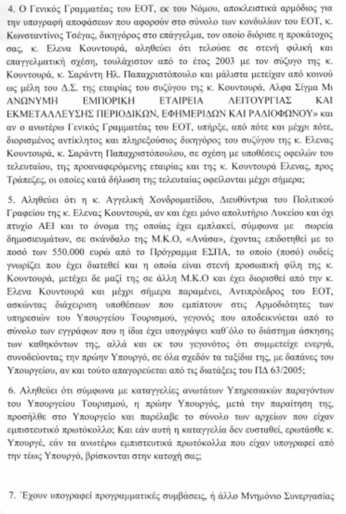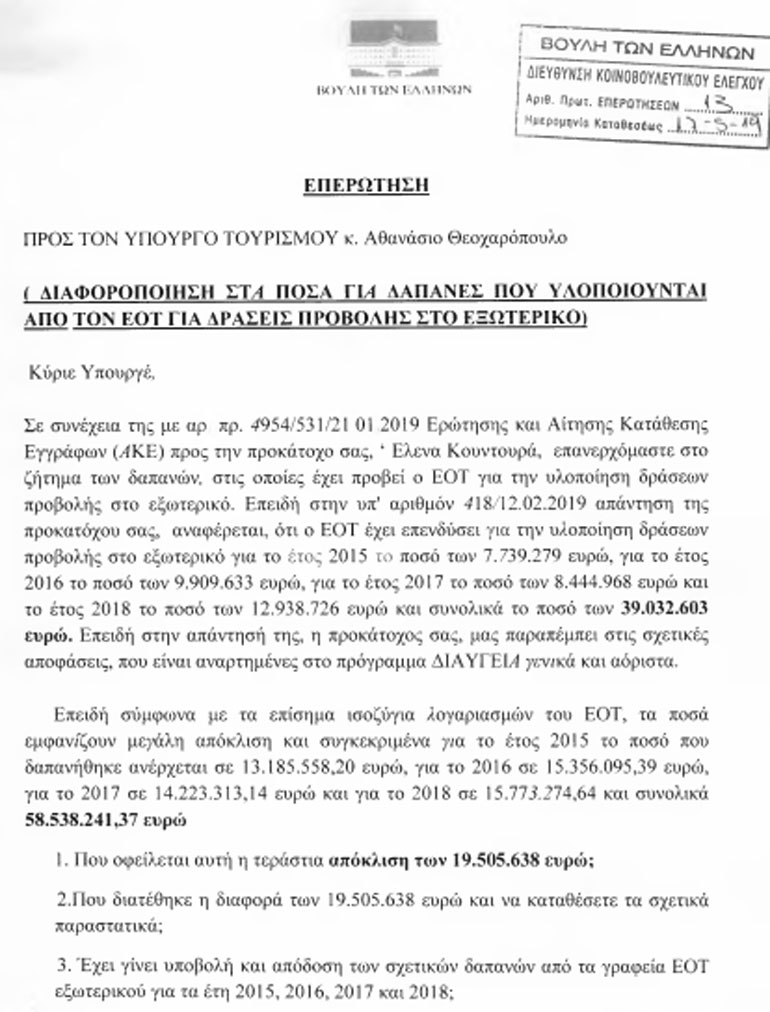 Η επερώτηση προς τον υπουργό Τουρισμού Θανάση Θεοχαρόπουλο αφορά στη «διαφοροποίηση στα ποσά για δαπάνες που υλοποιούνται από τον ΕΟΤ για δράσεις προβολής στο εξωτερικό» και στον έλεγχο των δραστηριοτήτων συνεργατών της Έλ. Κουντουρά, ενώ ερωτάται ο υπουργός αν ευσταθεί καταγγελία «ανωτάτων υπηρεσιακών παραγόντων του υπουργείου Τουρισμού, (ότι) η πρώην υπουργός, μετά την παραίτησή της, προσήλθε στο υπουργείο και παρέλαβε το σύνολο των αρχείων που είχαν εμπιστευτικό πρωτόκολλο».