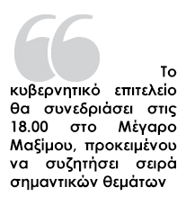 Το κυβερνητικό επιτελείο θα συνεδριάσει στις 18.00  στο Μέγαρο Μαξίμου, προκειμένου να συζητήσει σειρά «καυτών» προς επίλυση θεμάτων, έχοντας πάντα στραμμένο το βλέμμα στην αξιολόγηση του Σεπτεμβρίου από την τρόικα στο Παρίσι, τη ΔΕΘ και την εκλογή του Προέδρου της Δημοκρατίας. Το αλαλούμ με τον ΕΝΦΙΑ αναμένεται να αποτελέσει οδηγό για τον Αντώνη Σαμαρά, ο οποίος θα ξεκαθαρίσει πως μια λανθασμένη επιλογή ή μια καθυστέρηση στη λήψη αποφάσεων μπορεί να προκαλέσει σοβαρά προβλήματα στην ομαλή μετάβαση της χώρας από την ύφεση στην πολυπόθητη ανάπτυξη. Ήδη, ο πρωθυπουργός αναγκάστηκε να πάρει πάνω του το θέμα με τον ΕΝΦΙΑ και να δώσει εντολή για αποτίμηση των αξιών γης στα επίπεδα του 2013 για περίπου 4.000 οικισμούς, όπως καθορίστηκαν στον ΦΑΠ του 2013.