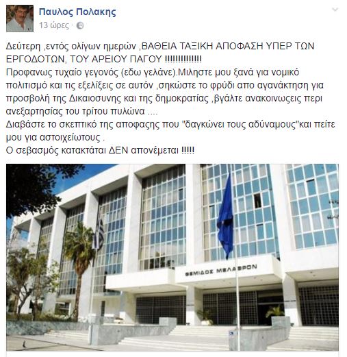 «Δεύτερη ,εντός ολίγων ημερών ,ΒΑΘΕΙΑ ΤΑΞΙΚΗ ΑΠΟΦΑΣΗ ΥΠΕΡ ΤΩΝ ΕΡΓΟΔΟΤΩΝ, ΤΟΥ ΑΡΕΙΟΥ ΠΑΓΟΥ !!!!!!!!!!!!!! Προφανώς τυχαίο γεγονός (εδώ γελάνε).Μιλήστε μου ξανά για νομικό πολιτισμό και τις εξελίξεις σε αυτόν, σηκώστε το φρύδι από αγανάκτηση για προσβολή της Δικαιοσύνης και της δημοκρατίας,βγάλτε ανακοινώσεις περί ανεξαρτησίας του τρίτου πυλώνα ….Διαβάστε το σκεπτικό της απόφασης που “δαγκώνει τους αδύναμους” και πείτε μου για αστοιχείωτους .