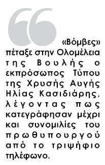 «Βόμβες» πέταξε στην Ολομέλεια της Βουλής ο εκπρόσωπος Τύπου της Χρυσής Αυγής Ηλίας Κασιδιάρης, ο οποίος αναστάτωσε όλο το πολιτικό σύστημα, λέγοντας πως κατεγράφησαν μέχρι και συνομιλίες του πρωθυπουργού από το τριψήφιο τηλέφωνο.