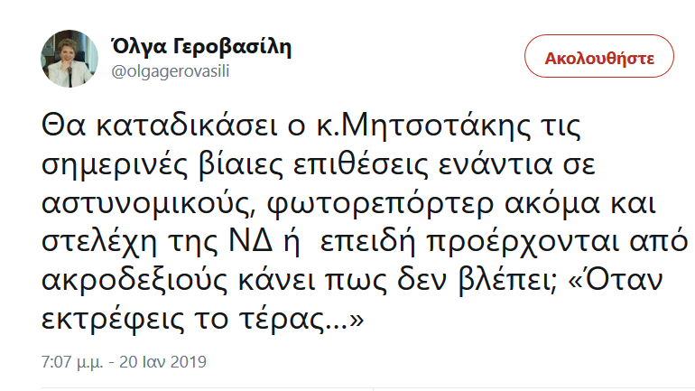 Επίσης η κ. Γεροβασίλη σε άλλο twitter αναφέρει : «Θα καταδικάσει ο κ.Μητσοτάκης τις σημερινές βίαιες επιθέσεις ενάντια σε αστυνομικούς, φωτορεπόρτερ ακόμα και στελέχη της ΝΔ ή επειδή προέρχονται από ακροδεξιούς κάνει πως δεν βλέπει; «Όταν εκτρέφεις το τέρας…».