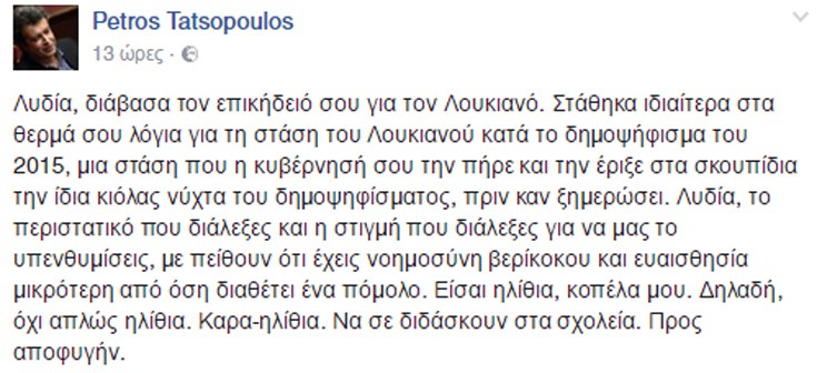 «Λυδία, διάβασα τον επικήδειό σου για τον Λουκιανό. Στάθηκα ιδιαίτερα στα θερμά σου λόγια για τη στάση του Λουκιανού κατά το δημοψήφισμα του 2015, μια στάση που η κυβέρνησή σου την πήρε και την έριξε στα σκουπίδια την ίδια κιόλας νύχτα του δημοψηφίσματος, πριν καν ξημερώσει. Λυδία, το περιστατικό που διάλεξες και η στιγμή που διάλεξες για να μας το υπενθυμίσεις, με πείθουν ότι έχεις νοημοσύνη βερίκοκου και ευαισθησία μικρότερη από όση διαθέτει ένα πόμολο. Είσαι ηλίθια, κοπέλα μου. Δηλαδή, όχι απλώς ηλίθια. Καρα-ηλίθια. Να σε διδάσκουν στα σχολεία. Προς αποφυγήν.»!