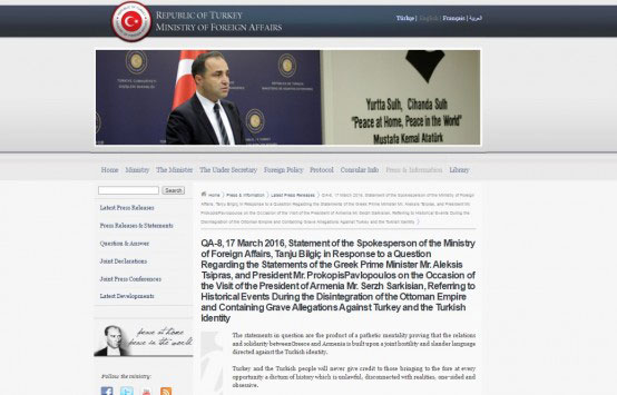 Σφοδρή επίθεση στην Ελλάδα και την Αρμενία για τις δηλώσεις που έγιναν την Τρίτη στην Αθήνα σχετικά με την Γενοκτονία των Αρμενίων κατά τις συναντήσεις του Αρμένιου προέδρου Σερζ Σαρκισιάν με τον πρωθυπουργό Αλέξη Τσίπρα – αλλά και τον Πρόεδρο της Δημοκρατίας Προκόπη Παυλόπουλο εξαπέλυσε το τουρκικό υπουργείο Εξωτερικών.