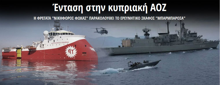 Παρά το γεγονός ότι το ελληνικό ΓΕΕΘΑ διατήρησε ιδιαίτερη ψυχραιμία όσον αφορά στο σύνηθες συμβάν μεταξύ του τουρκικού ερευνητικού σκάφους «Μπαρμπαρόσα» και της ελληνικής φρεγάτας «Νικηφόρος Φωκάς» στην περιοχή μεταξύ του «οικοπέδου 4» της κυπριακής ΑΟΖ και του σημείου όπου εφάπτονται η ελληνική υφαλοκρηπίδα και η κυπριακή ΑΟΖ, τα τουρκικά ΜΜΕ από το μεσημέρι της Πέμπτης με τίτλους – κραυγές και πολεμοχαρή συνθήματα ανεβάζουν τους τόνους για ένα περιστατικό που οι ελληνικές στρατιωτικές αρχές κρίνουν πως μέχρι στιγμής δεν είναι καθόλου σοβαρό.