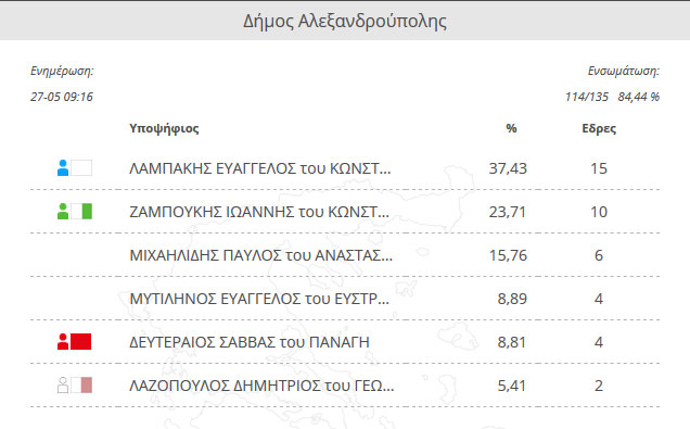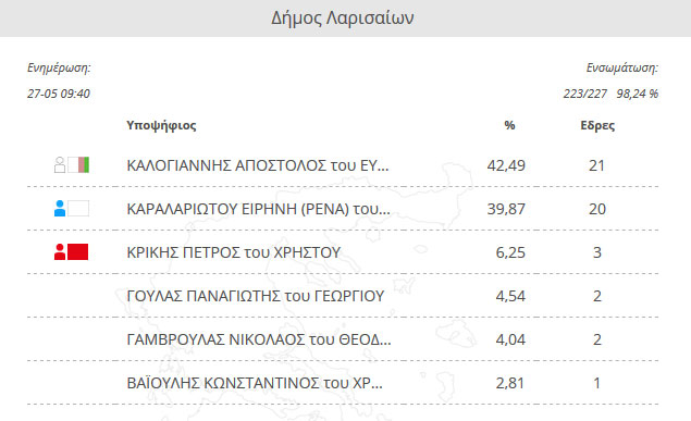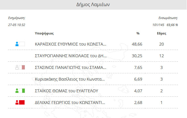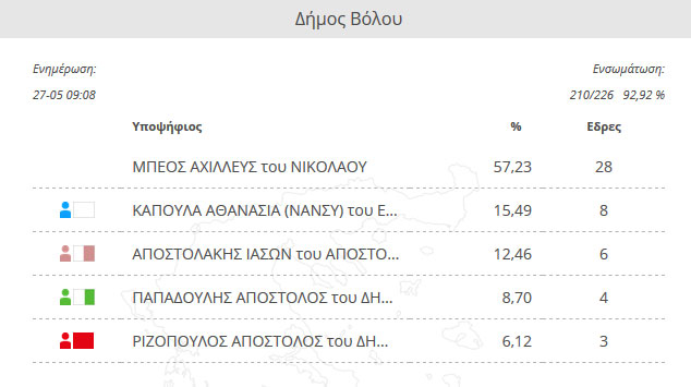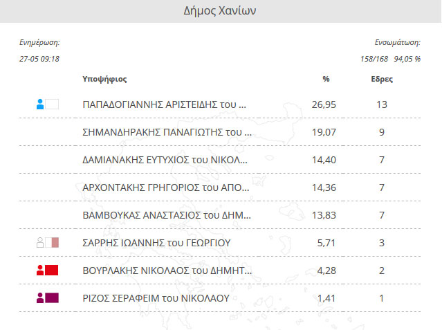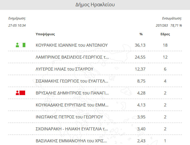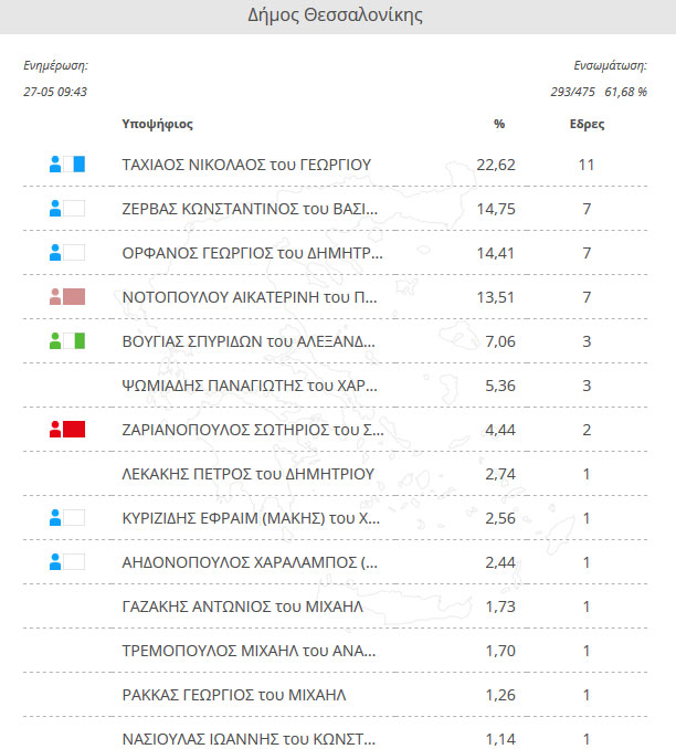 Δείτε παρακάτω τα αποτελέσματα των δημοτικών εκλογών σε μεγάλους δήμους της χώρας και το αντίστοιχο ποσοστό ενσωμάτωσης, όπως διαμορφώνονται περίπου στις 10.30 το πρωί: