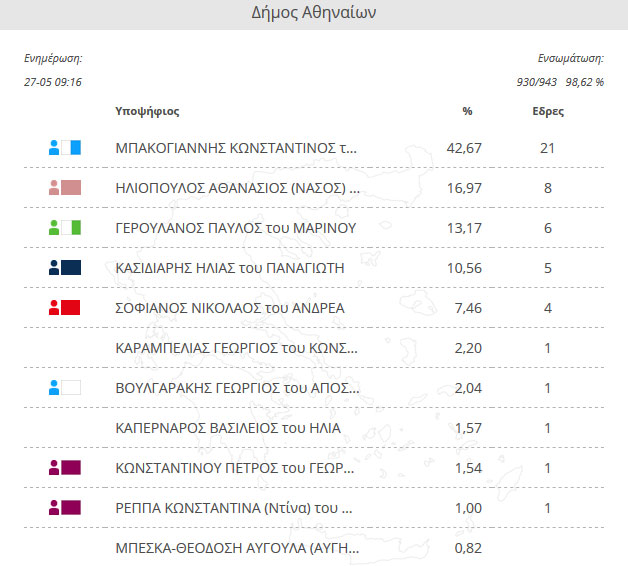 Στον Δήμο Αθηναίων με καταμετρημένο το 98,62% των ψήφων πρώτος έρχεται ο Κώστας Μπακογιάννης με ποσοστό 42,67% και ακολουθεί ο Νάσος Ηλιόπουλος με 16,97%.