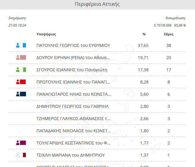 Στην Αττική ο κ. Γιώργος Πατούλης με 37,65% πήρε την πρώτη θέση και σημαντικό προβάδισμα για τον δεύτερο γύρο έναντι της κας Ρένας Δούρου, η οποία ήταν κάτω του 20%.