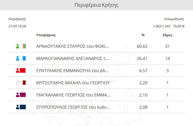 Επίσης, της Ηπείρου με τον Αλέξανδρο Καχριμάνη (57,11%), της Θεσσαλίας με τον Κώστα Αγοραστό (56,95%), του Νοτίου Αιγαίου με τον Γιώργο Χατζημάρκο (54,13%) και της Δυτικής Μακεδονίας με τον Γιώργο Κασαπίδη (52,11%). Όλοι τους είχαν εκλεγεί περιφερειάρχες και το 2014, εκτός του κ. Κασαπίδη, ο οποίος νίκησε από τον πρώτο γύρο τον νυν περιφερειάρχη Δυτικής Μακεδονίας Θεόδωρο Καρυπίδη που στηριζόταν από τον ΣΥΡΙΖΑ. Στην Κρήτη επανεξελέγη περιφερειάρχης με 60,63 % ο Σταύρος Αρναουτάκης, ο οποίος είχε τη στήριξη του ΚΙΝΑΛ και του ΣΥΡΙΖΑ.