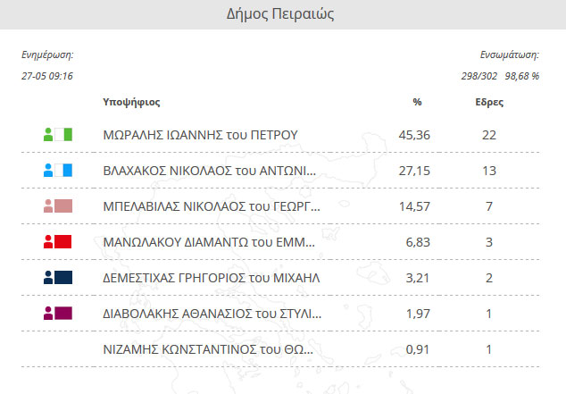 Στον Δ. Πειραιά, ο Γ. Μώραλης αναδεικνύεται πρώτος στην εκλογική μάχη με 45,36% και ακολουθεί ο Ν. Βλαχάκος με ποσοστό 27,15%.