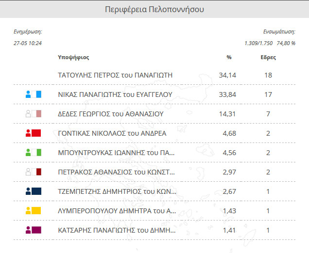 Ντέρμπι στην Πελοπόννησο, όπου ο νυν περιφερειάρχης ανεξάρτητος κ. Πέτρος Τατούλης κατέλαβε με καταμετρημένο το 74,80% των ψήφων ποσοστό 34,14% έναντι 33,84% του κ. Παναγιώτη Νίκα της ΝΔ.