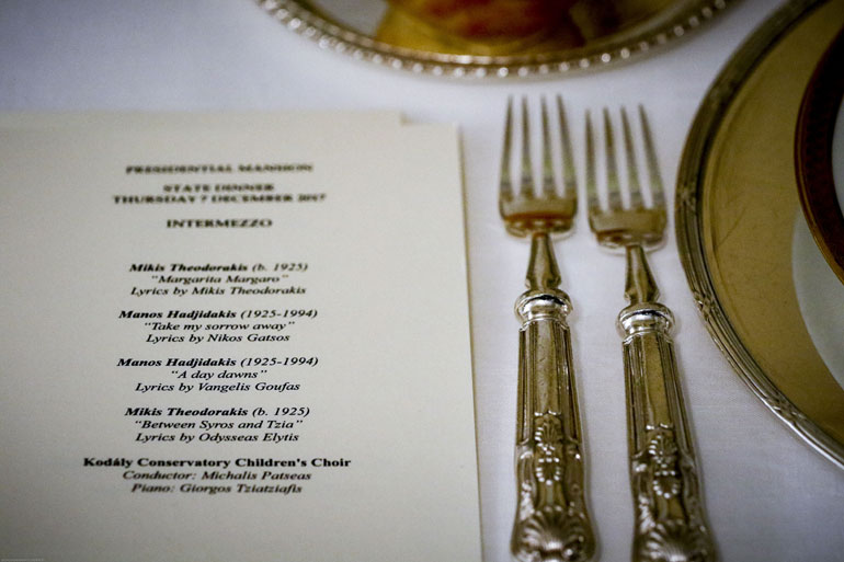 Επίσημο δείπνο προς τιμήν του Ταγίπ Ερντογάν και της συζύγου του πραγματοποιήθηκε λίγο μετά τις 19.30 την Πέμπτη στο Προεδρικό Μέγαρο.