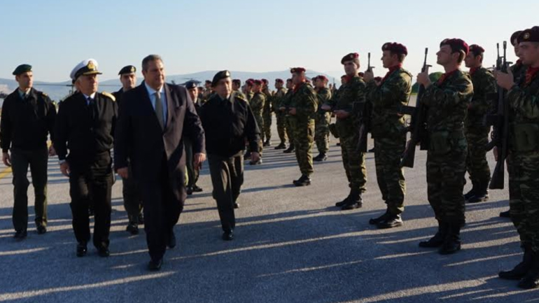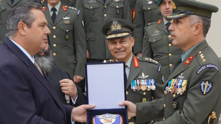 Ο Υπουργός Εθνικής Άμυνας, Πάνος Καμμένος, συνοδευόμενος από τον Αρχηγό ΓΕΕΘΑ Ναύαρχο Ευάγγελο Αποστολάκη ΠΝ και τον Αρχηγό ΓΕΣ Αντιστράτηγο Βασίλειο Τελλίδη, παρέστη στην Τελετή Απονομής Πολεμικής Σημαίας που πραγματοποιήθηκε στο Κέντρο Εκπαιδεύσεως Ανορθόδοξου Πολέμου (ΚΕΑΠ) στη Ρεντίνα και απένειμε τα πτυχία στους απόφοίτους του 98ου Σχολείου Καταδρομών.