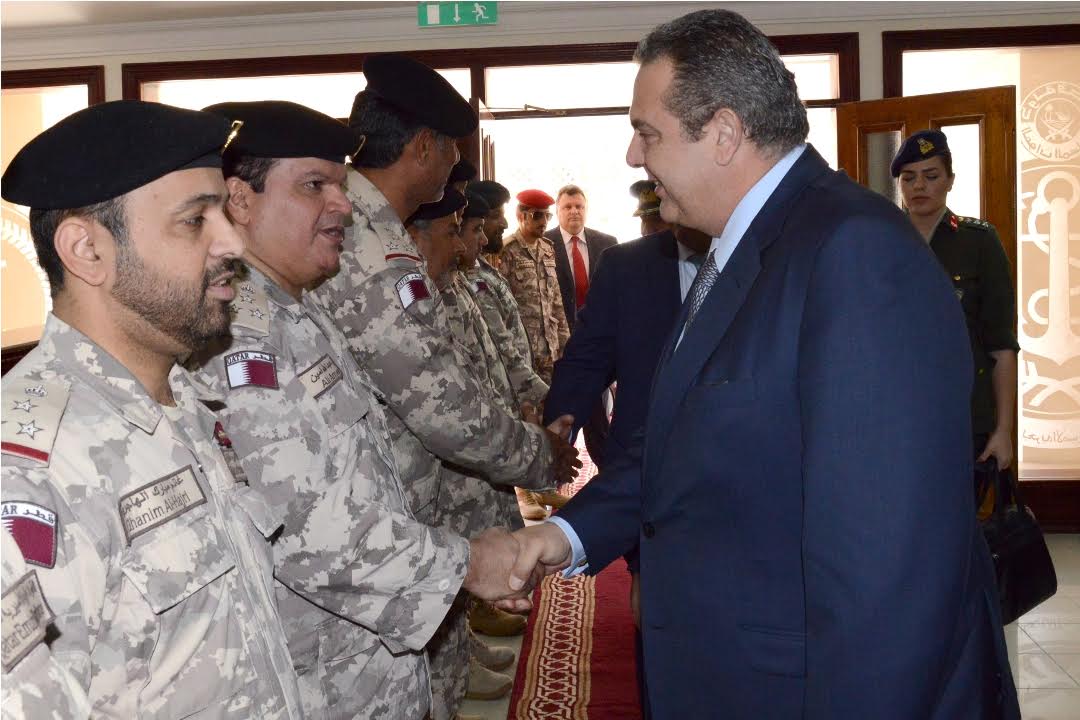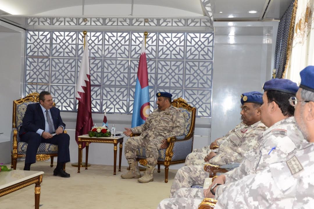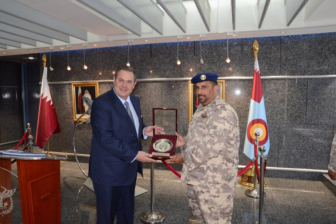 Ο υπουργός Εθνικής Άμυνας, Πάνος Καμμένος, στο πλαίσιο της επίσημης επίσκεψης που πραγματοποιεί στο Κατάρ, επισκέφθηκε την Αεροπορική Βάση του Εμιράτου, όπου συναντήθηκε με τον Αρχηγό της Πολεμικής Αεροπορίας του Κατάρ Υποπτέραρχο Mubarak bin Mohamed al-Kumait al-Khayarin.
