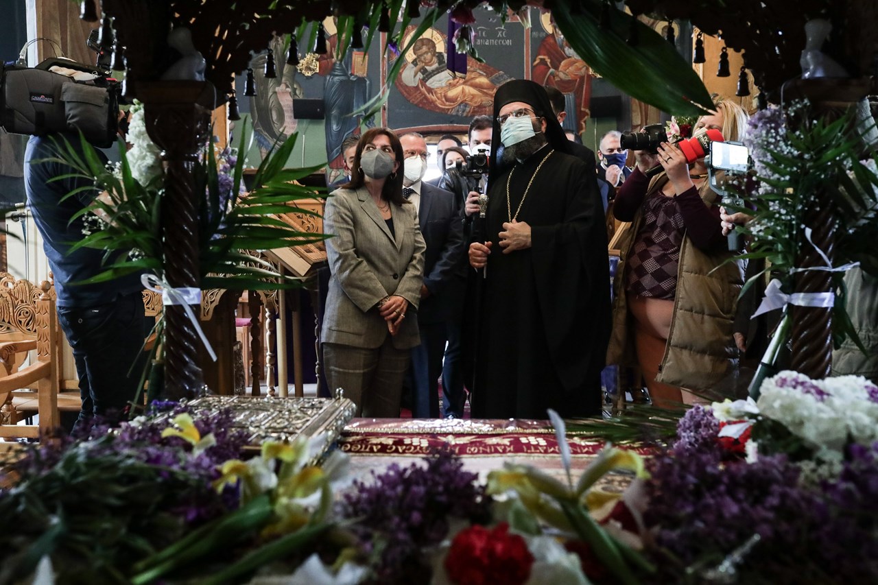 Η Πρόεδρος της Δημοκρατίας μετέβη στον ιερό ναό του Αγίου Κωνσταντίνου και Ελένης όπου την υποδέχθηκε ο μητροπολίτης Κομοτηνής Παντελεήμων, προσκύνησε τον Επιτάφιο και είδε το τέμπλο και εικόνες που τις έφεραν μαζί τους οι πρόσφυγες και τοποθέτησαν στην εκκλησία το 1928 κατά την ανέγερση της.