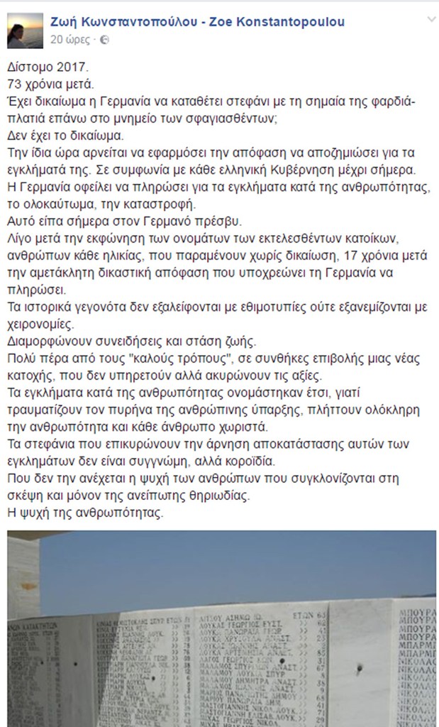 H Ζωή Κωνσταντοπούλου επιχείρησε να εξηγήσει γιατί προχώρησε στην πράξη αυτή τονίζοντας πως δεν έχει δικαίωμα η Γερμανία να καταθέτει στεφάνι γράφοντας «τα στεφάνια που επικυρώνουν την άρνηση αποκατάστασης αυτών των εγκλημάτων δεν είναι συγγνώμη, αλλά κοροϊδία».