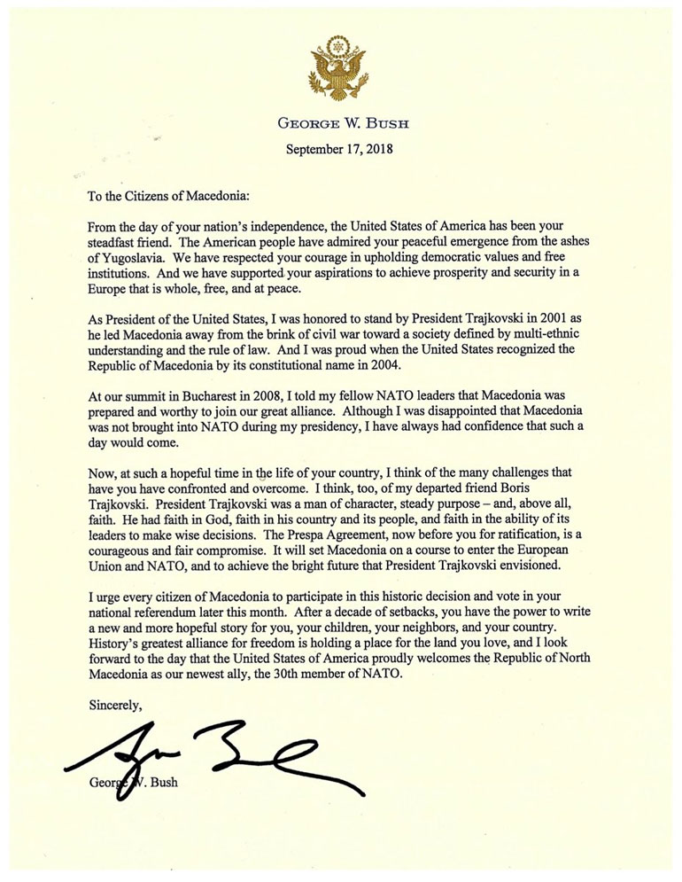 «Η Συμφωνία των Πρεσπών είναι ένας γενναίος και δίκαιος συμβιβασμός» αναφέρει σε ανοικτή του επιστολή προς τους πολίτες της ΠΓΔΜ ο πρώην πρόεδρος των Ηνωμένων Πολιτειών Τζορτζ Μπους ο νεότερος και συμπληρώνει πως «θα βάλει τη Μακεδονία σε μια πορεία για να εισέλθει στην Ε.Ε. και στο ΝΑΤΟ».
