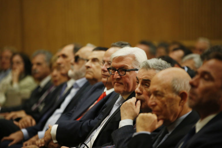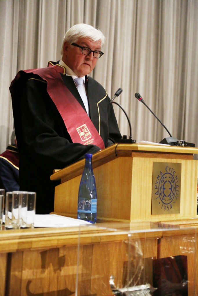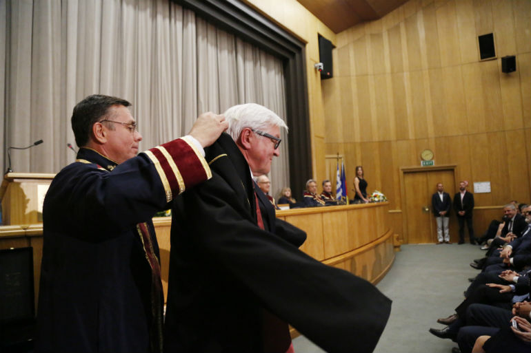 «Αγάπα τον φίλο σου με τα ελαττώματά του». Με αυτή τη ρήση στα ελληνικά άρχισε την ομιλία του ο υπουργός Εξωτερικών της Γερμανίας Φρανκ Βάλτερ Σταϊνμάγερ, στην τελετή αναγόρευσής του σε επίτιμο διδάκτορα του Πανεπιστημίου Πειραιώς.