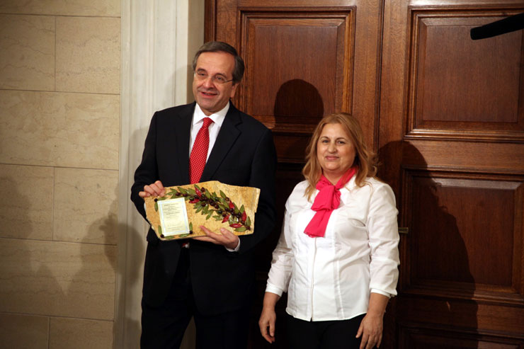 Την αρχή έκανε ο σύλλογος «Νέοι Ορίζοντες» του δήμου Ευρώτα Λακωνίας. Το πρωθυπουργό ζεύγος ευχήθηκε σε όλους «Χρόνια Πολλά» και η υπεύθυνη του συλλόγου έδωσε στον κ. Σαμαρά το βραβείο «Λιόπετρα», που είναι χαρακτηριστικό της Μάνης, καθώς πρόκειται για ένα κλαδί ελιάς πάνω σε μια πέτρα.