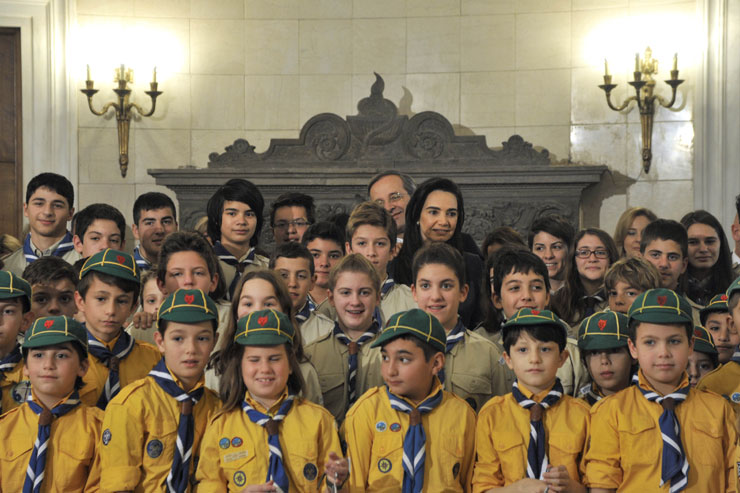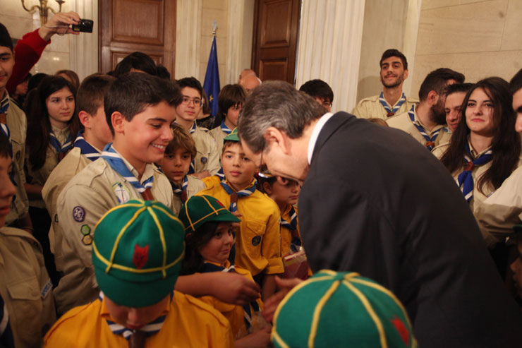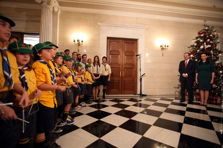 Αμέσως μετά, ο πρωθυπουργός άκουσε τα κάλαντα από την μπάντα της Ελληνικής Αστυνομίας και της Πυροσβεστικής και από προσκόπους και συγκεκριμένα από το Σώμα Ελλήνων Οδηγών.