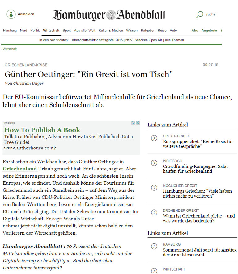 Σε συνέντευξη που παραχώρησε στην εφημερίδα «Hamburger Abendblatt» ο ευρωπαίος επίτροπος αρμόδιος για την Ψηφιακή Οικονομία Γκίντερ Έτινγκερ επεσήμανε ότι «οι διαπραγματεύσεις μεταξύ της Ελλάδας και της ΕΕ για την παροχή νέας βοήθειας είναι σωστές» και τόνισε ότι «το Grexit έχει φύγει από το τραπέζι».