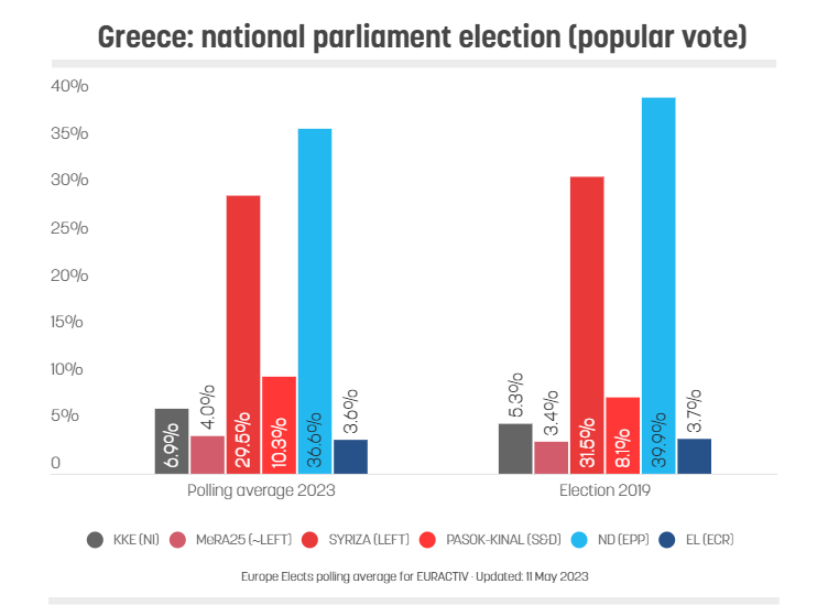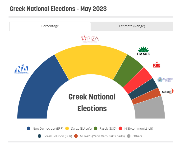 Σύμφωνα με το EuropeElects, που παρέχει τον μέσο όρο των εθνικών δημοσκοπήσεων, η Νέα Δημοκρατία θα μπορούσε να λάβει το 36,6% των ψήφων στον πρώτο γύρο, ακολουθούμενη από τον ΣΥΡΙΖΑ με 29,5% και το ΠΑΣΟΚ με 10,3%.
