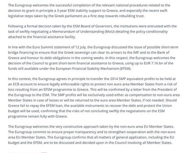 Το Eurogroup χαιρετίζει την επιτυχή ολοκλήρωση των σχετικών εθνικών διαδικασιών που σχετίζονται με την απόφαση να εγκριθεί επί της αρχής ένα τριετές πρόγραμμα στήριξης του Ευρωπαϊκού Μηχανισμού Σταθερότητας (ESM) προς την Ελλάδα και ιδιαίτερα τα γρήγορα βήματα νομοθέτησης που έκανε το ελληνικό κοινοβούλιο ως πρώτο βήμα προς την επανάκτηση της εμπιστοσύνης», αναφέρει η ανακοίνωση του οργάνου.