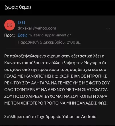 Νωρίτερα βουλευτές της Νέας Δημοκρατίας κατήγγειλαν ότι αργά το βράδυ της Πέμπτης έλαβαν σειρά απειλητικών και υβριστικών email, τα οποία –σύμφωνα με τον εισηγητή του κόμματος, Μακάριο Λαζαρίδη- προέρχονται από συγκεκριμένη ηλεκτρονική διεύθυνση. Ο βουλευτής της ΝΔ τόνισε πως τα επίμαχα email θα κατατεθούν στο τμήμα Δίωξης Ηλεκτρονικού Εγκλήματος και πρόσθεσε: «Καθιστούμε υπεύθυνη εάν μας συμβεί κάτι τη Ζωή Κωνσταντοπούλου».