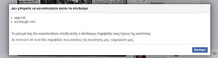 Αντίστοιχο μήνυμα εμφανίζεται και σε όσους προσπαθούν να αναρτήσουν συνδέσμους από αυτές τις σελίδες στο Twitter.