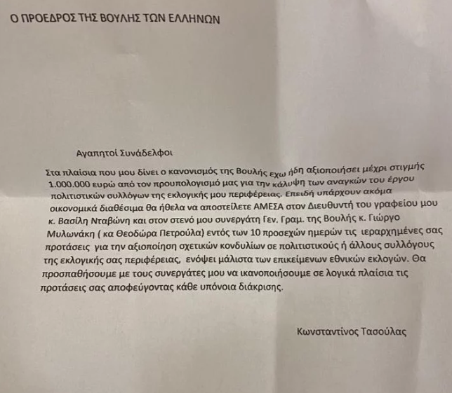 Μια ψεύτικη επιστολή με την υπογραφή του Κωνσταντίνου Τασούλα, στην οποία ο πρόεδρος της Βουλής φαίνεται να μοιράζει εκατομμύρια στους βουλευτές για τον προεκλογικό τους αγώνα έριξε στις θυρίδες ένας άγνωστος φαρσέρ.