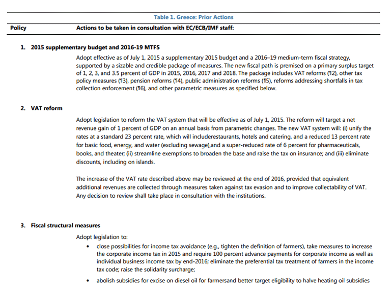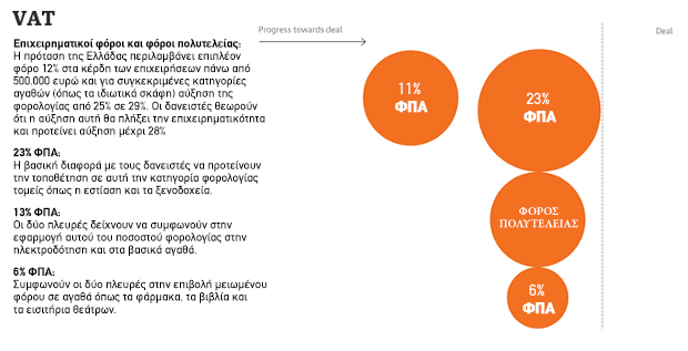 Το άλλο σημαντικό σημείο τριβής είναι η αναδιάρθρωση του καθεστώτος του ΦΠΑ. Οι πιστωτές έχουν αρχικά ζητήσει ένα απλοποιημένο σύστημα δύο βαθμίδων με τα περισσότερα αγαθά να φορολογούνται με 23%. Οι πιστωτές τώρα συμφωνούν με την ελληνική ιδέα ενός συστήματος τριών βαθμίδων, καθώς και έναν ιδιαίτερα μειωμένο συντελεστή 6% για τα φάρμακα, τα βιβλία και το θέατρο.