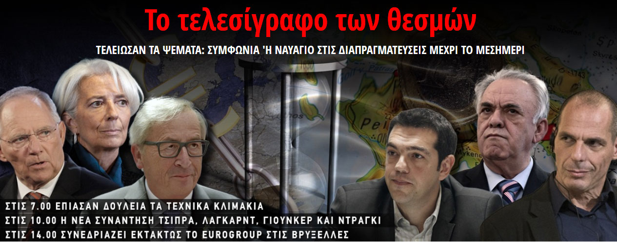 Παρά το θετικό κλίμα που καλλιεργήθηκε το πρωί από τις πληροφορίες που ανέφεραν ότι οι εργασίες των τεχνικών κλιμακίων εξελίχθηκαν εποικοδομητικά, όταν έληξε το τελεσίγραφο των εταίρων, τελικά κατατέθηκαν δύο ξεχωριστά κείμενα: ένα από την ελληνική πλευρά και ένα ακόμη που περιλαμβάνει τις προτάσεις σοκ που έχουν βάλει στο τραπέζι των διαπραγματεύσεων οι πιστωτές (Περιλαμβάνει μέτρα ύψους 11 δις ευρώ περίπου).
