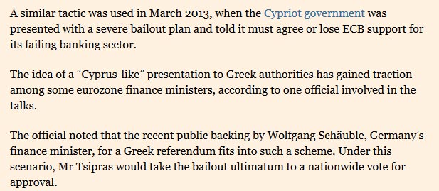 Bόμβα στις διαπραγματεύσεις ρίχνουν οι Financial Times με άρθρο του γνωστού δημοσιογράφου Πέτερ Σπίγκελ. Οι FT αναφέρουν ότι οι δανειστές είναι έτοιμοι να δώσουν τελεσίγραφο προς την Ελλάδα αντίστοιχο με εκείνο που είχε δοθεί τον Μάρτιο του 2013.