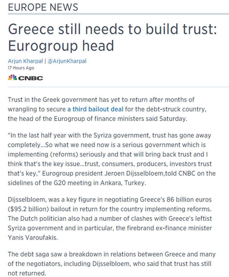 Επέμεινε δε ότι, παρά την «στροφή» της κυβέρνησης Τσίπρα, η εμπιστοσύνη δεν είναι κάτι δεδομένο. «Στο τέλος η κυβέρνηση Τσίπρα αποφάσισε ότι θέλει να μείνει στην ευρωζώνη, ότι θα δεχθεί ορισμένα βασικά σημεία και ότι θα δεσμευθεί στην εφαρμογή ενός συγκεκριμένου προγράμματος. Εάν, τώρα, με ρωτάτε εάν η εμπιστοσύνη έχει επιστρέψει, νομίζω ότι είναι νωρίς ακόμη για να απαντήσω θετικά, θα χρειαστεί χρόνος» σημείωσε.